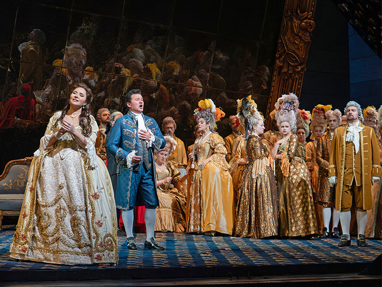 Above: Sonya Yoncheva, Piotr Beczala, Nancy Fabiola Herrera, and Igor Golovatenko in Act I of ANDREA CHENIER; a MetOpera photo.