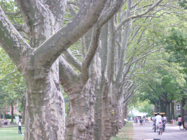Saturday August 21, 2010 – Kokyat and I went over to Governors Island today. The very brief boat ride (it leaves from South Ferry, right next to the Staten Island ferry pier) barely takes five minutes. You step off into a crowd of bicyclists, strollered infants and somewhat dazed tourists all of whom have come over from the bigger island of Manhattan. Although there are many buildings (including a hospital and 3 churches), private homes and apartment units on Governors Island, no one lives there.