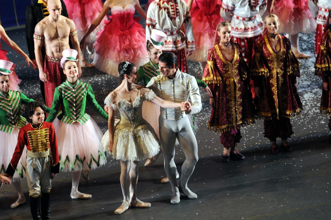 The Battle of the Mice is a rather helter-skelter affair. Then we’re off to the Snow scene where Clara and her boy-prince encounter their older selves in the persons of Veronika Part and Marcelo Gomes. The younger and older couple have a sort of parallel pas de deux; there’s lots of hugging and excitement over being with someone you love but the choreography for Part & Gomes seems hellbent on making them look their worst for the most part. You have two of the greatest dancers in the world at your disposal and this is all you could think of to do? Meanwhile the snowflakes are doing some dancing but it isn’t cohesive; in fact it’s rather random….and they sometimes lay down on the floor. Their petite leaps in place make lots of toe-shoe racket on the stage, causing me to yearn for Balanchine’s swift, magical and winter-quiet snowflakes. Where are Mary Sell and Sarah Villwock when you need them? Well, anyway, all the ABT snowflakes appear to die at the end of the scene. Drosselmeyer pushes on a large sleigh but its runners have not been oiled and there’s a loud screeching sound. He manages to run over the tutu of one of the recumbent snowflakes before her gets Clara and her boy-prince into the sleigh to head for Sugar Plum Land.