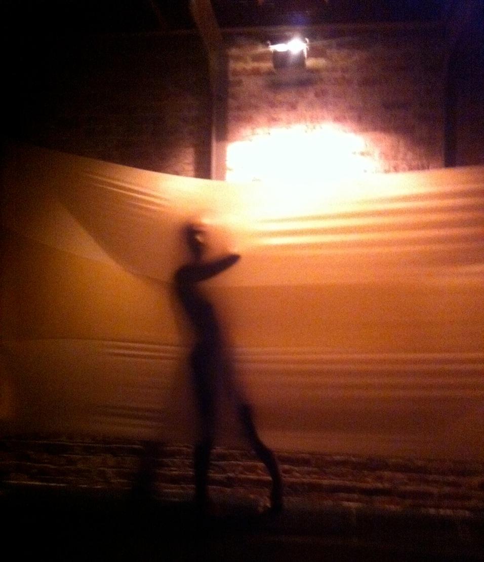 Among the many highlights of this installation is a dramatic solo performed by Cedar Lake’s inimitable Jon Bond behind a gold-lighted panel of fabric thru which the dancer’s shadow and the images of his face and body pressing againt the shroud produce a nightmarish effect from which he eventually breaks free.