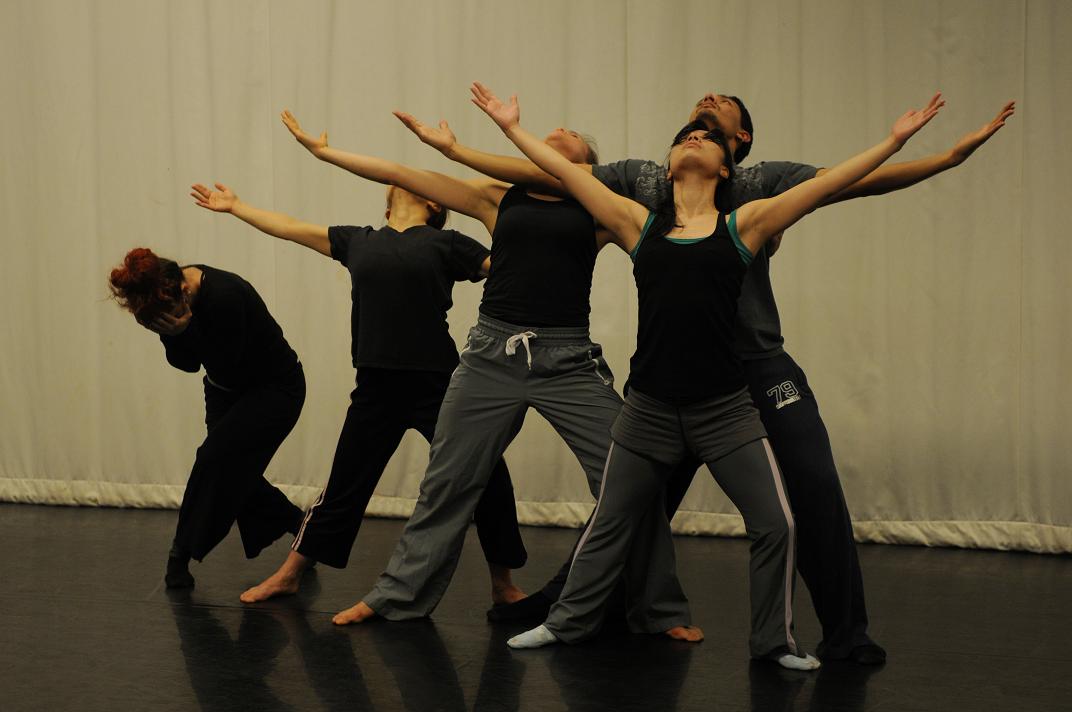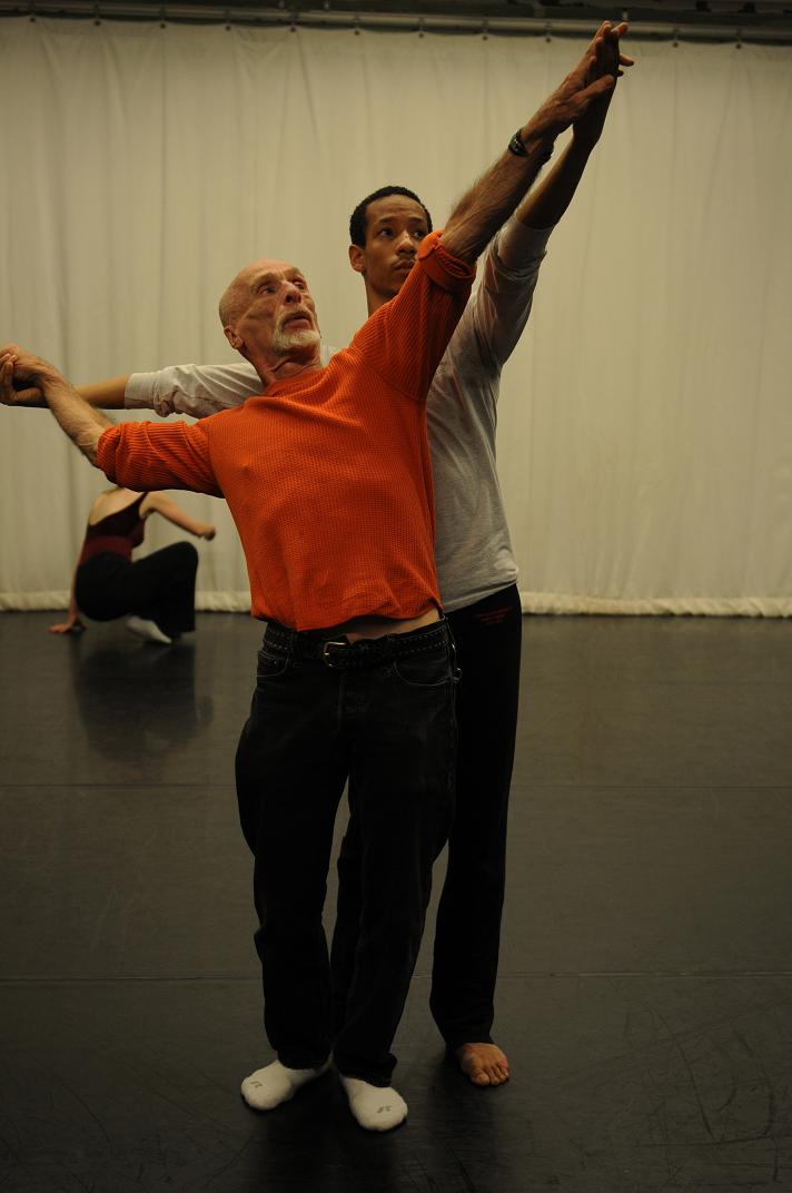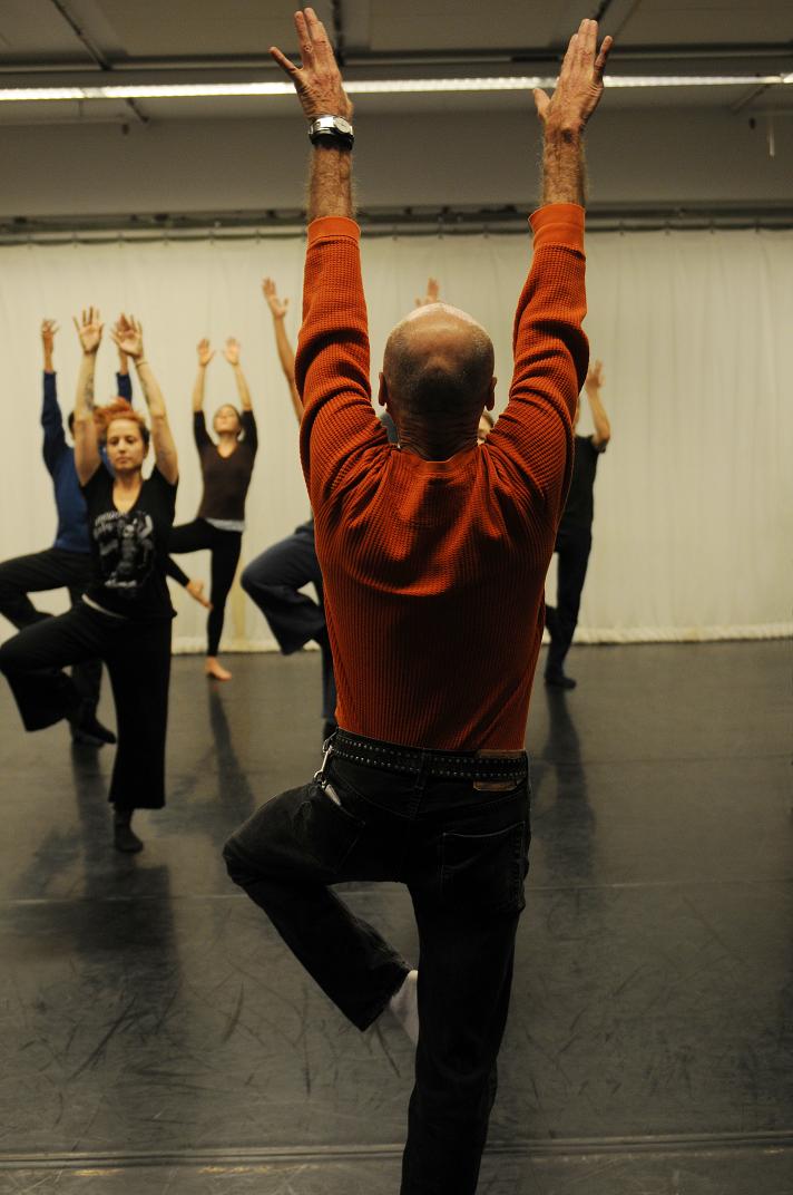 Jim May, artistic director of Sokolow Theatre Dance, gave the dancers – an assembly of Company members and free-lancers – a brisk warm up that included some shouting. Then we saw a run-thru of the opening movement of ODES.