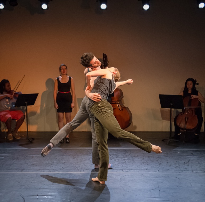 Colby Damon ’s Let me Live (above photo) opened the evening impressively, with a string quintet playing Julie Hill‘s evocative score live onstage. Ms. Hill’s plaintive, unamplified singing wove thru the shiningly lyrical textures of the strings; her natural voice lent an air of vulnerability to the piece. Dancers Chloe Felesina and Ian Hussey performed Colby’s pas de deux with perfect expressiveness; their complex relationship veers from tenderness to traces of violence. In its unity of music, movement and mood this piece made a strong impact.