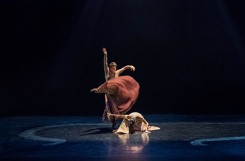 Pargalava’s Variation opens to the sound of Martha Graham’s voice speaking about the solo that inspired all these variations. Soon a haunting melody from Mahler’s ‘Songs of the Wayfarer’ is heard. In flesh-coloured tights, the delicate XiaoChuan Xie and her three demi-god partners – Ben Schultz, Lloyd Knight, and Lloyd Mayor – move with a sense of flowing lyricism through intricate partnerings in which Chuan alternately sinks down and is lifted on high. The dancers and the dance certainly wove a hypnotic spell tonight.