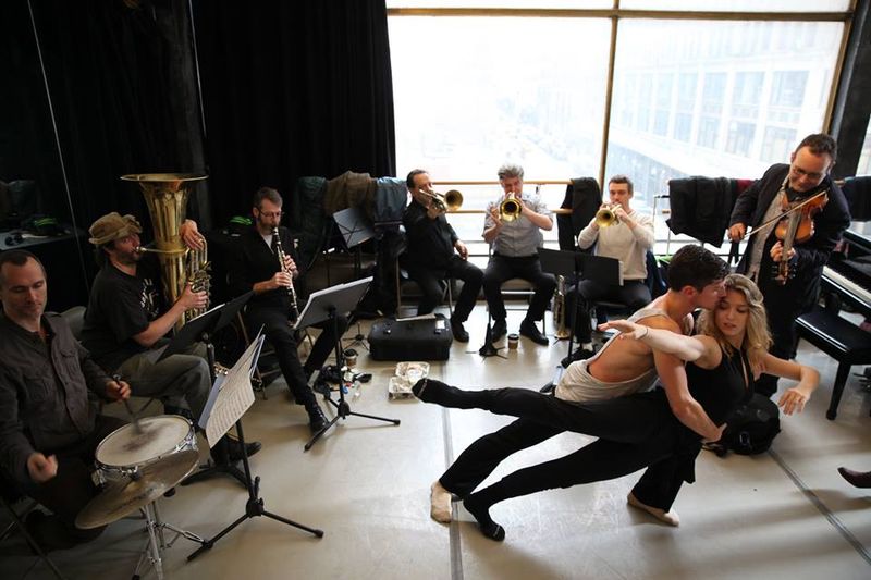 Two pas de deux for Geena Pacareu and Ian Spring (above, rehearsing with the musicians of Ljova in a David Parsons photo) are high points in this excellent work; in the longer of the two, the voice of Inna Barmash cast a spell over the theatre with her one-word vocalise – talk about creating an atmosphere! – to which Ian and Geena responded with dancing that was truly heartfelt.