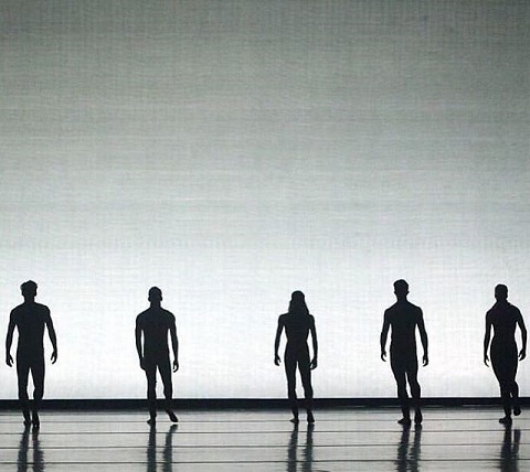 The elegy from Mr. Corigliano’s Concerto for Clarinet and Orchestra creates an atmosphere of luminously pensive mystery…even before the dancing begins. The eight dancers, clad in Ms. Karan’s provocatively ‘nude’ costumes, enter in slow-motion from upstage left; they cross the diagonal and pause center-stage where they become entwined and entangled. Individual dancers rise out of the dense human hive only to inexplicably vanish again. Suddenly they begin to move faster, though the music maintains is eerie adagio tempo. As the music fades, the tribe gather their energy to continue their diagonal trajectory, moving toward some unknown fate.