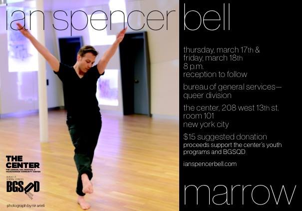 Tonight at the Lesbian, Gay, Bisexual & Transgender Community Center on 13th Street, Ian performed his newest work, MARROW, in the intimate yet airy space of the recently-renovated Room 210. It was in the same setting, last June, that Ian’s double bill of GEOGRAPHY SOLOS and HOLLER made such a distinctive impression.
