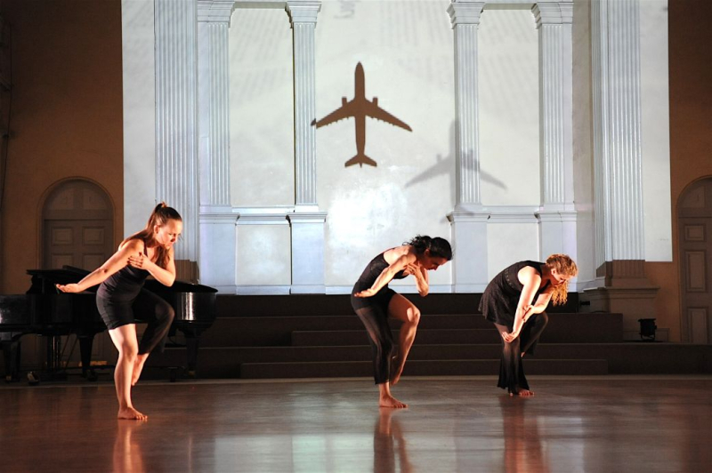 The premiere of Ms. Gallant’s Retrograde Universe (above, in Melanie Furotian’s photo) offered a fine contrast to The Secret. Alternating passages of silence with music of Steve Reich, this piece found excellent interpreters in Michelle Cohen, Megan Minturn, Erica Lessner, and Charlotte Henrickson. The girls periodically flung themselves to the floor, or burst into paroxysms of anxious movement, whilst at other moments they simply stand stock still, striking sculptural poses. Whimsical projections of newsprint and of an airplane whose pilot had clearly lost his sense of direction added a touch of mystery to the work, which seemed at times to be going on a bit too long, but which was kept on track by the energies of the four dancers.