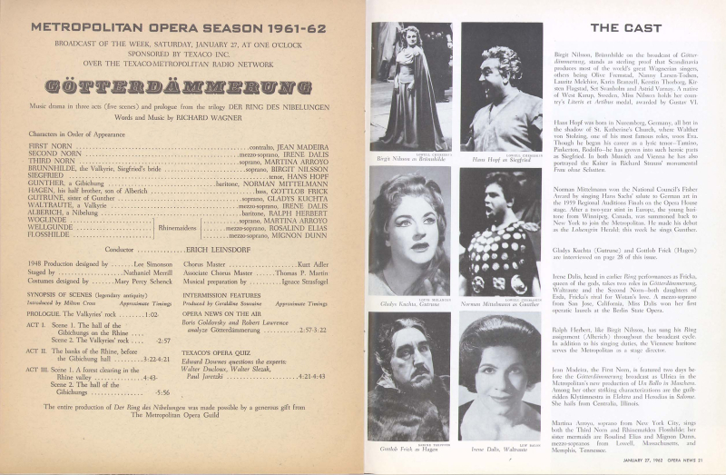 Coming randomly upon an excerpt from Act II of Wagner’s GÖTTERDÄMMERUNG – from my premiere encounter with that opera – I was taken back over the decades to a wintry afternoon in January, 1962, when I heard Wagner’s “grand finale of the RING Cycle” for the very first time. At age fourteen, I had already been an opera-lover for three years when the complete RING was broadcast via the Texaco-Metropolitan Opera Radio Network.