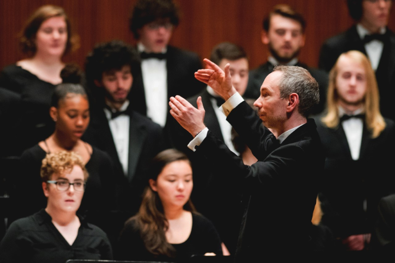 For the first half of the concert, the Ronald O. Perelman Stage belonged to the Oberlin College Choir under the baton of Gregory Ristow (photo, above). They began with Triptych, a mostly tonal choral composition written in 2005 by the British-American composer Tarik O’Regan. Though originally cast for chorus and orchestra (and what a sight to behold that would’ve been!), it was presented here in a more manageable arrangement for percussion and chorus by the percussionist and composer Dave Alcorn. It featured an eclectic text culled from such myriad sources as William Blake, John Milton, William Wordsworth, Muhammad Rajab al-Bayoumi, and the Book of Psalms, among others.