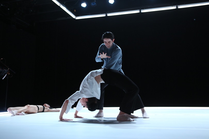 As the Ghost dances a solo, Abandonment, the Lover – having put his shirt and trousers on – reappears and again sits on the stool. Ms. Eda, as the Ghost, collapses to the floor as her Double appears. Mr. Laverde-Koenig and Ms. French now engage in a pas de deux, Hijacked Mind, which replicates his earlier duet with Ms. Eda.