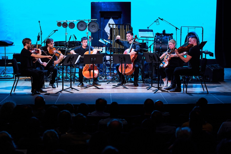 Above: composer John Zorn; Sae Hashimoto, percussion; Jay Campbell, cello; Michael Nicolas, cello; Ches Smith, percussion