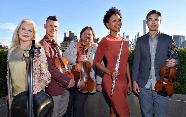 Above: the members of ETHEL – Dorothy Lawson, Kip Jones, Ralph Farris, and Corin Lee – with flautist Allison Loggins-Hull; photo from the ensemble’s website