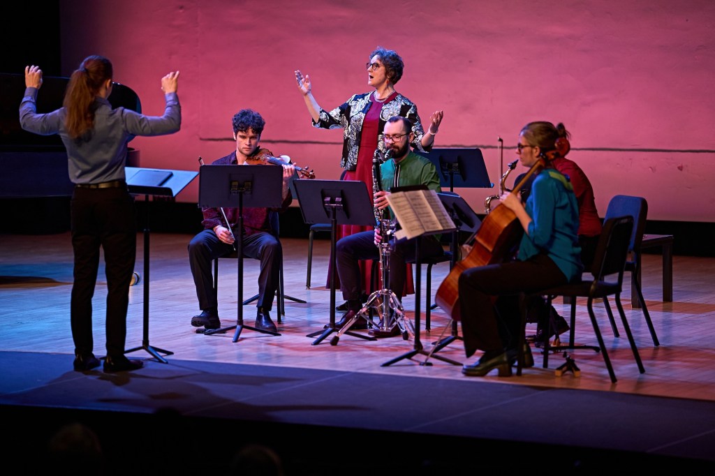 The second piece on the program was called Balloon Variations, which was a premiere and a “study” for an opera she is writing. The opera is based on a true story of the first woman who went up in a hot air balloon, who happened to be an opera singer – she sang an Aria from the balloon. In this piece, some of the instrumentalists played guitars as well as their other instruments – in some cases, holding them at the same time which seemed extremely precarious but didn’t result in any disasters. The whole thing was definitely whimsical (there was also a power drill involved) and at one point the ensemble got the audience to participate by singing the word “balloon” in a simple phrase (so maybe it really is a mass choral piece like those I remember hearing about).