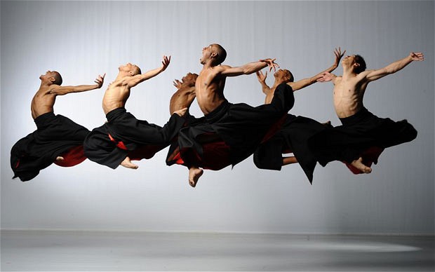 CARILLONS begins with ten men onstage; they wear dark fitted costumes with one arm bare; semi-see-thru tops are accented with panels of deep reds or blues. They dance to one of Bizet’s most familiar tunes, soon joined by the women whose wine-toned skirts give the piece an aspect of visual richness. (There is a backdrop but it’s not visible from the 5th Ring).