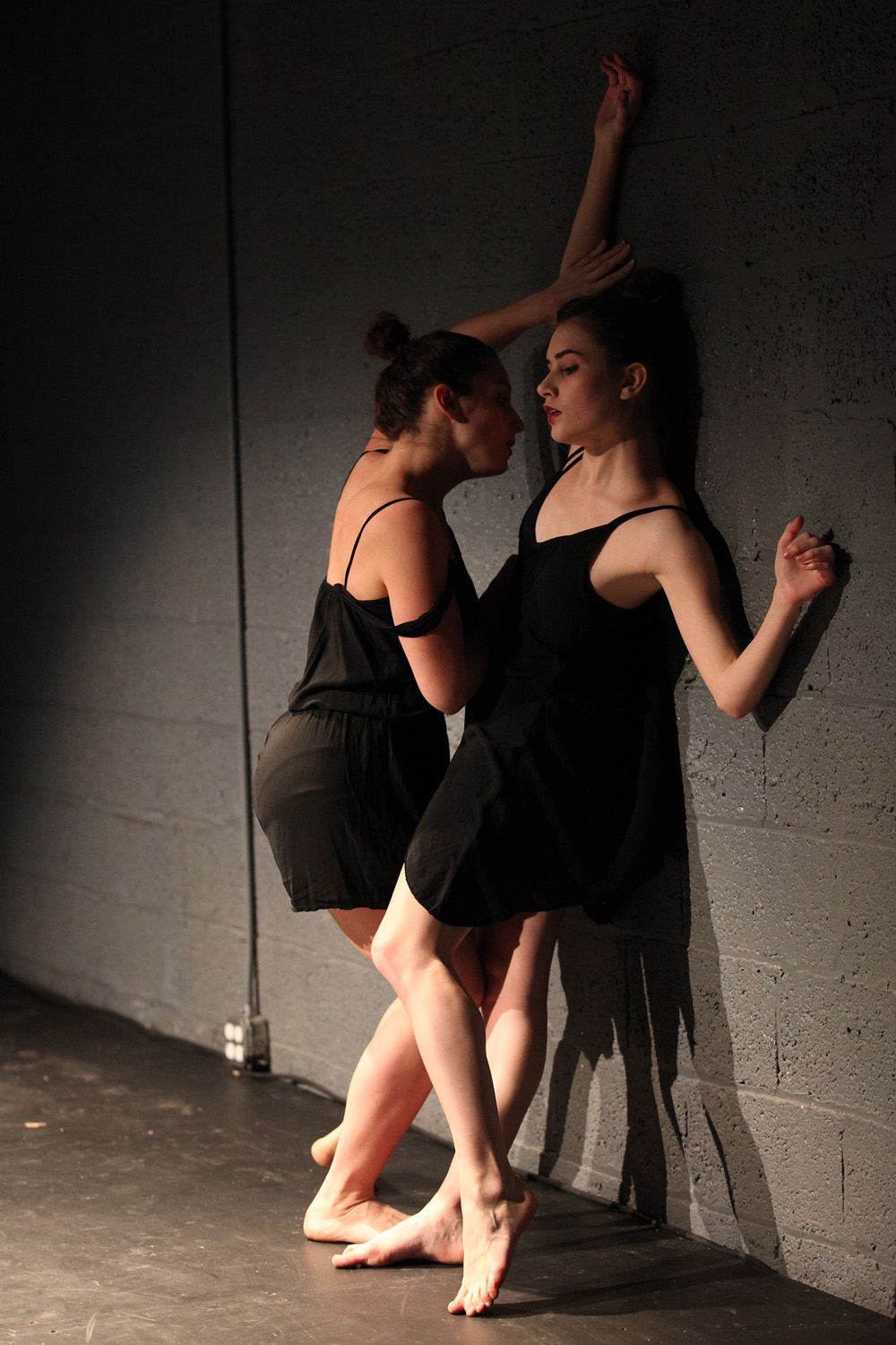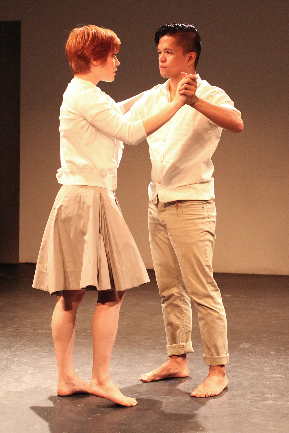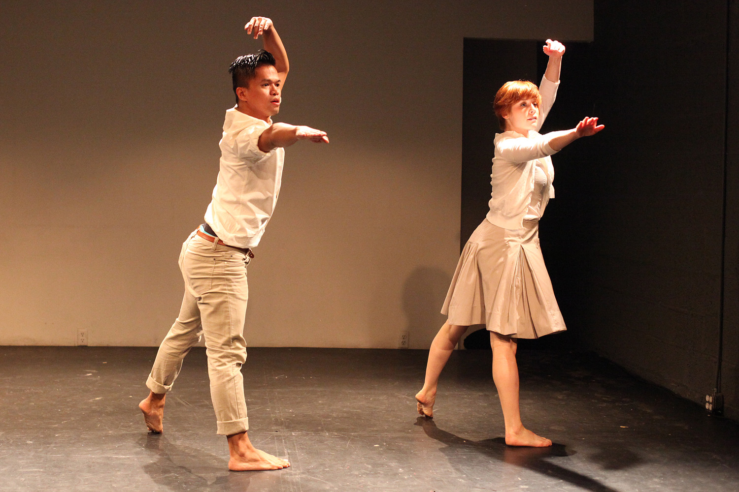 In Christina Ilisije’s solo bad cog, the dancer showed her trademark fluency of movement to a percussive/industrial score (with electrc guitar coming in later) by Philip Knowlton. Marlon Cherry’s opening piano theme evolved into moody, jazzy music while the lovely Remi Harris made her moves dovetail to the rhythmic patterns: this was image control. Two solos for men found Andrea Gise’s choreography at its most inventive: a sleep-study called non-disclosure act danced by Joshua Tuason, and a brilliant theatrical vignette entitled slick, performed by Felix Hess. From among the colorful palette of music we were hearing, Kristen Kairos’ work for two flutes was especially evocative as danced by Jennifer Eisenberg in quell.