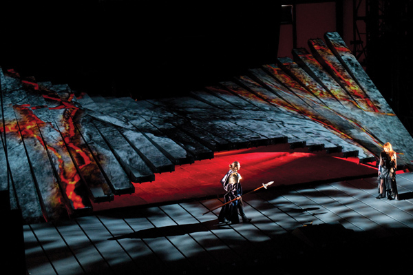 Flywires, mechanicals and the occasional stagehand are visible from time to time in the Lepage setting, preventing an illusion of magic. The planks rise and fall and fan out to modestly interesting effect, but placing the action on a bare Wieland Wagner disc would have been equally convincing and cost a hell of a lot less.