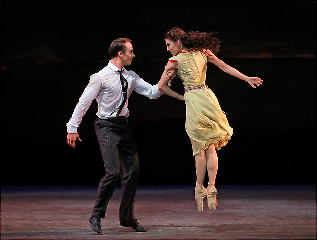 Four colour-coordinated trios are introduced in succession and then the principal couple of Sterling Hyltin and Gonzalo Garcia appear. This is a great role for Sterling where her natural charm and stage savvy are in full play, her tricky pointe work and a series of slowing pirouettes particularly impressive. Gonzalo is handsome, technically polished and subtly droll. In their perky yellow costumes, Sterling and Gonzalo brought this Balanchine rarity vividly to life.