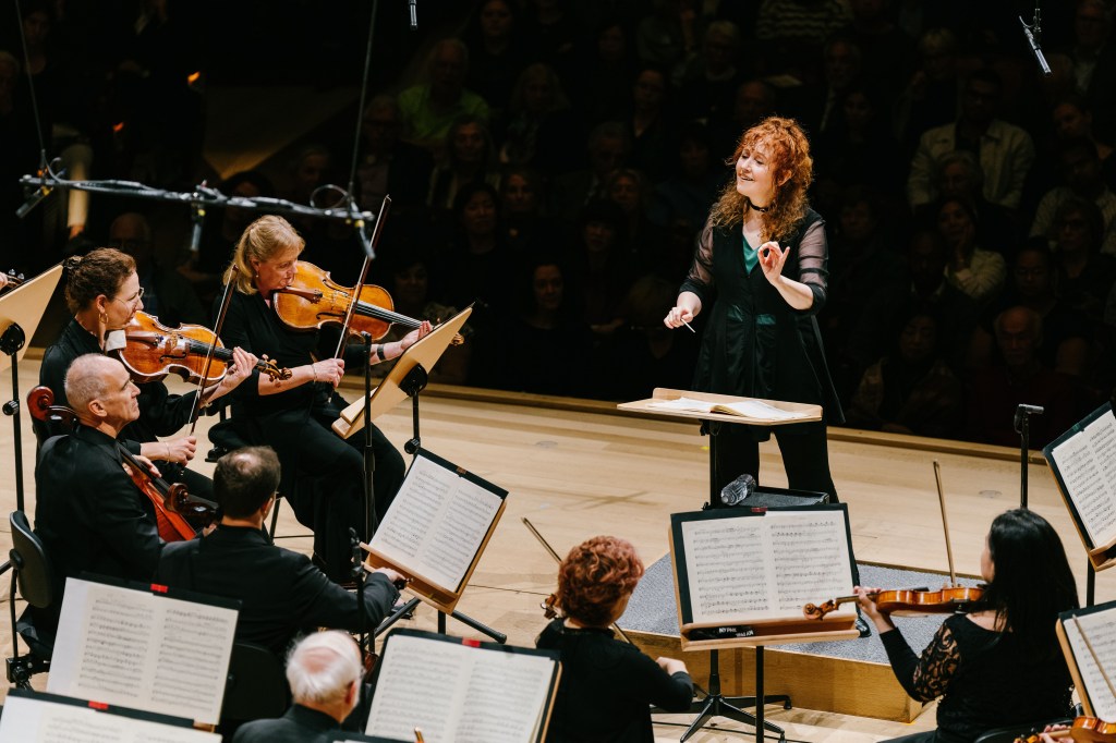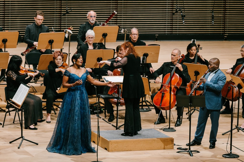 Above: Jeannette Sorrell on the podium, with the evening’s soloists Sonya Headlam and Anthony McGill. Photo by Fadi Kheir.