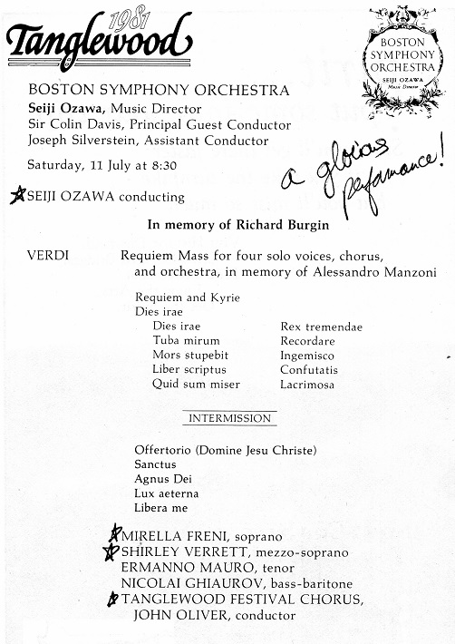 One of the greatest musical experiences of my life took place at Tanglewood on July 11th, 1981: a performance of the Verdi REQUIEM by the Boston Symphony Orchestra conducted by Seiji Ozawa, with soloists Mirella Freni, Shirley Verrett, Ermanno Mauro, and Nicolai Ghiaurov.