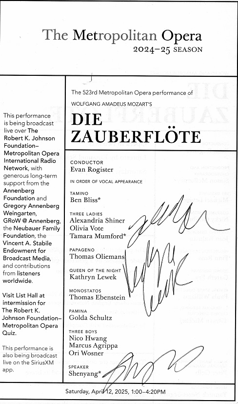 Saturday April 12th, 2025 matinee – I have been looking forward to this afternoon’s performance of the McBurney Zauberflöteat The Met ever since I saw parts of it back in 2023. I had not expected to be so taken with the production, and I was glad today to have an opportunity see all of it, and to hear some fine singing. I will admit that, in the second act, a sense of longuers sometimes crept over me, possibly a result of not sleeping well in the past few nights. I was rather surprised to see so many empty seats in the House today.
