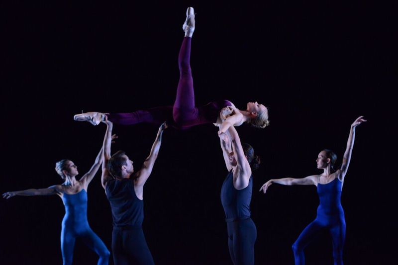 The choreographer responds to this music with movement that has a broad overall sweep but also features countless felicitous and original touches. Amber Neff is thrice tossed into the air, spiraling before being caught by her partner Drew Grant; the blondes – Kaitlyn Gilliland and Elizabeth Claire Walker – dance in tandem; and a sustained duo for Ms. Walker and Mr. Grant is particularly striking. A pas de trois for Ms. Neff, Francis Lawrence, and Da’Von Doane progresses to a pensive solo danced by the incomparable Kaitlyn Gilliland. There are stretches of visual polyphony; the dancers form a circle before sweeping into a triple pas de deux set to the score’s most lyrical theme. Then the dancers rush off in the end, leaving the stage to the musicians.