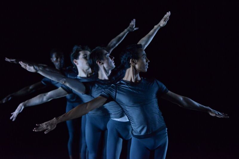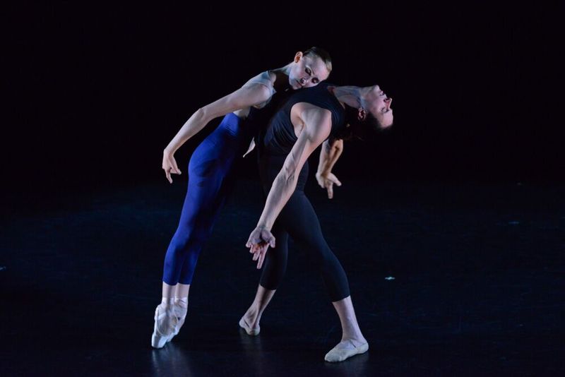 Following the interval, the atmosphere became spiritual as Vigil, a pas de deux danced by Elinor Hitt and Da’Von Doane to sacred choral music by Tomás Luis de Victoria and Sergei Rachmaninoff which was performed live onstage by the 20-member choir Tapestry. The singers, clad in black, arranged themselves in a semi-circle around the dance-space; they are a wonderful, physically diverse group of musicians and they harmonized with a kind of gentle intensity that created an atmosphere of both reverence and hope.