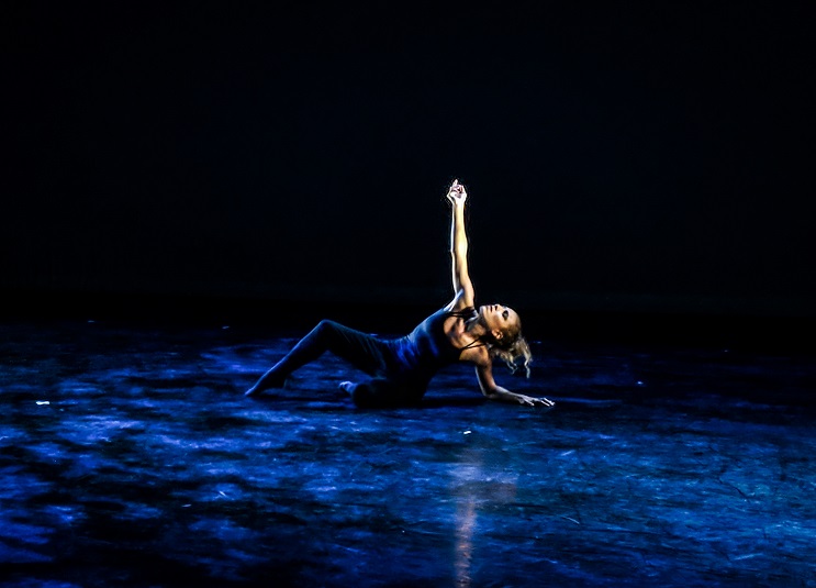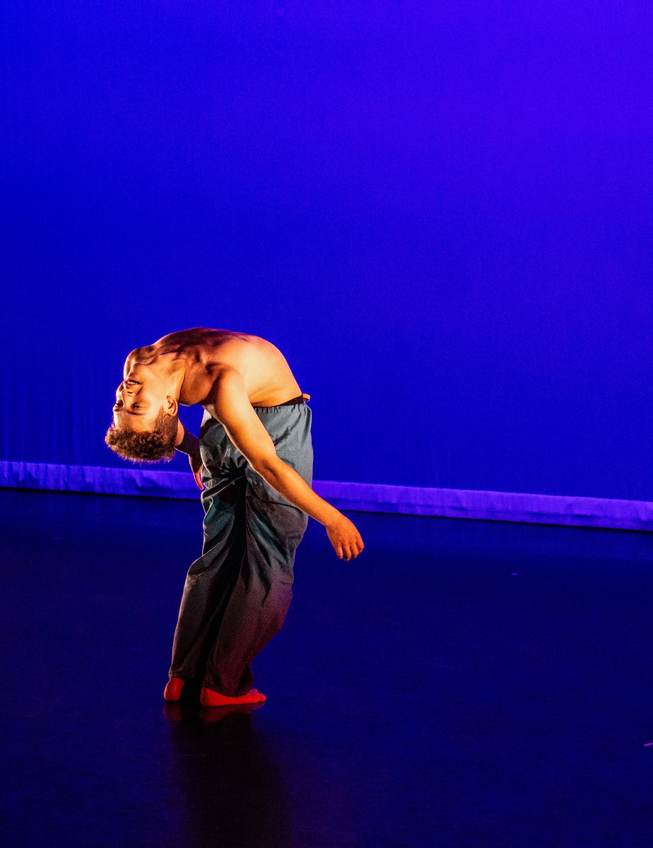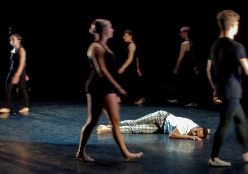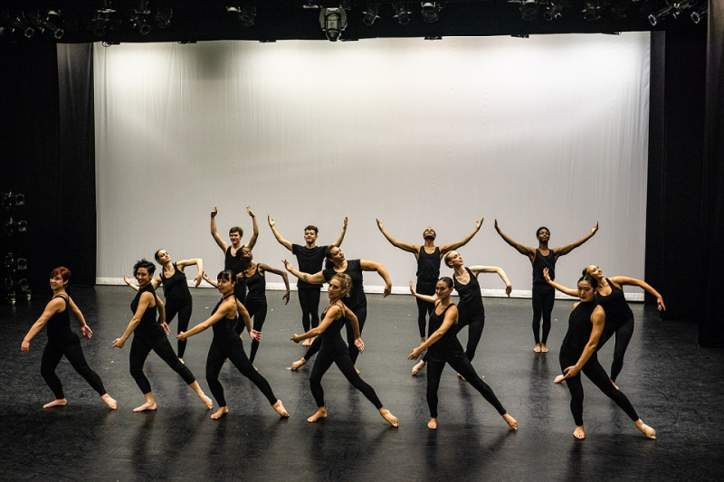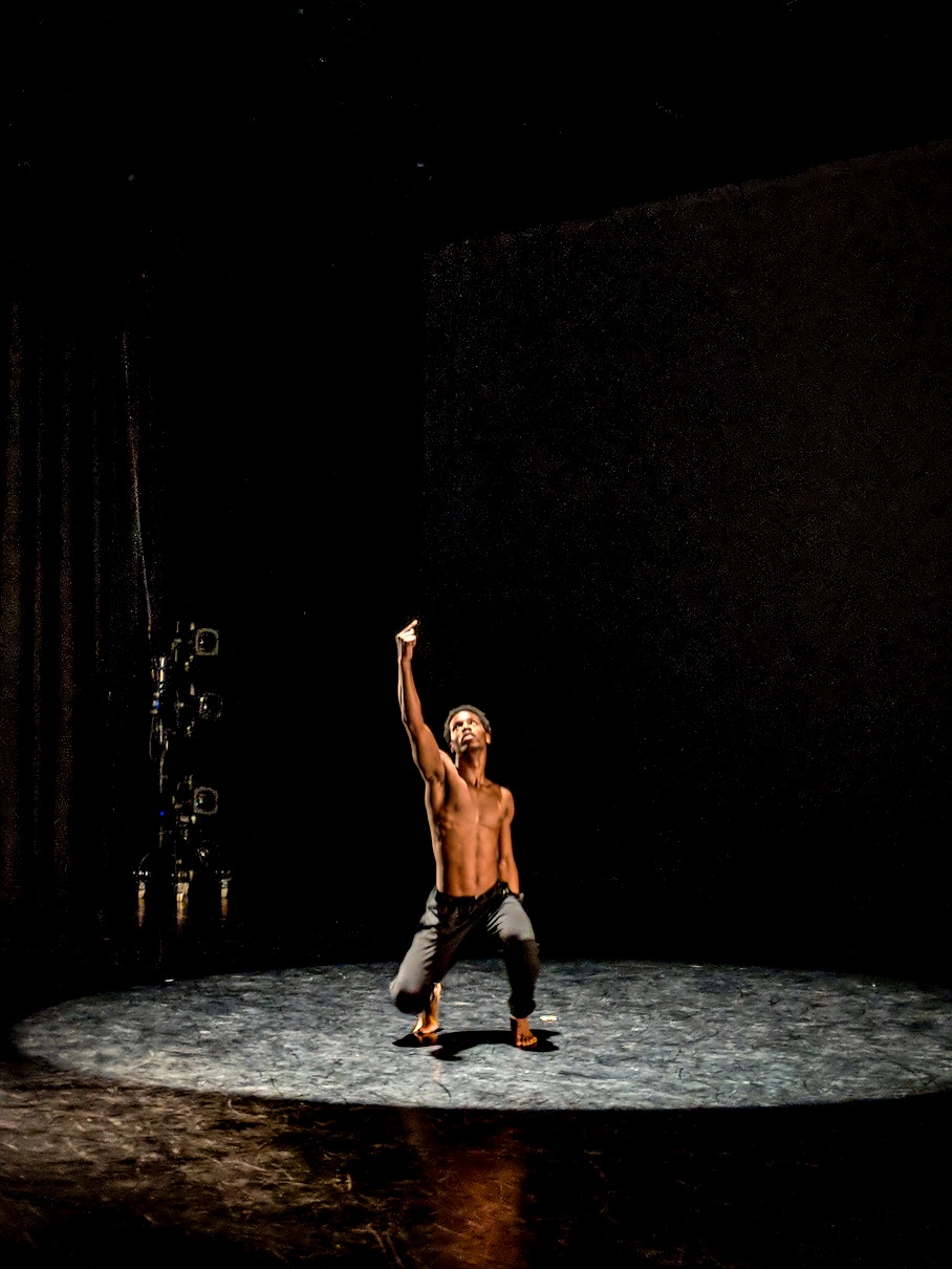 Following the interval, the atmosphere became spiritual as Vigil, a pas de deux danced by Elinor Hitt and Da’Von Doane to sacred choral music by Tomás Luis de Victoria and Sergei Rachmaninoff which was performed live onstage by the 20-member choir Tapestry. The singers, clad in black, arranged themselves in a semi-circle around the dance-space; they are a wonderful, physically diverse group of musicians and they harmonized with a kind of gentle intensity that created an atmosphere of both reverence and hope.