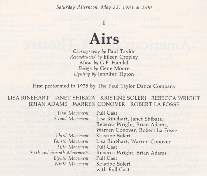 I was a confirmed lover of classical ballet when my first view of Paul Taylor’s choreography came in 1981 with ABT performing AIRS: