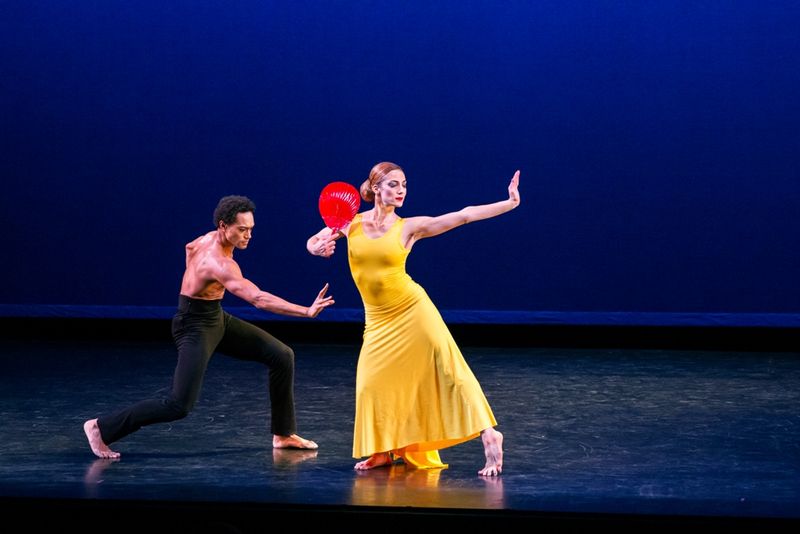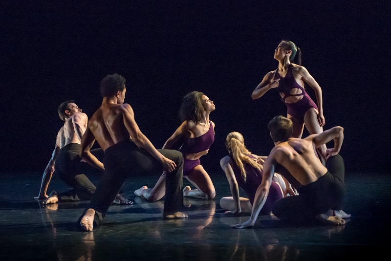 Pargalava’s Variation opens to the sound of Martha Graham’s voice speaking about the solo that inspired all these variations. Soon a haunting melody from Mahler’s ‘Songs of the Wayfarer’ is heard. In flesh-coloured tights, the delicate XiaoChuan Xie and her three demi-god partners – Ben Schultz, Lloyd Knight, and Lloyd Mayor – move with a sense of flowing lyricism through intricate partnerings in which Chuan alternately sinks down and is lifted on high. The dancers and the dance certainly wove a hypnotic spell tonight.