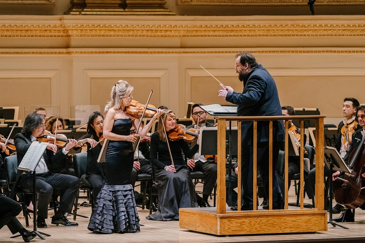 The great Anne-Sophie Mutter (above, photo by Fadi Kheir) performed two works: Mozart’s Violin Concerto No. 1 in B-flat major, KV 207 and the New York premiere of Thomas Adès’ Air (Homage to Sibelius) for Violin and Orchestra.