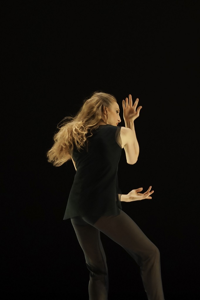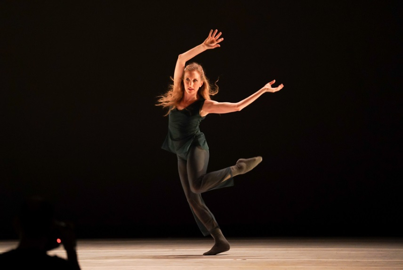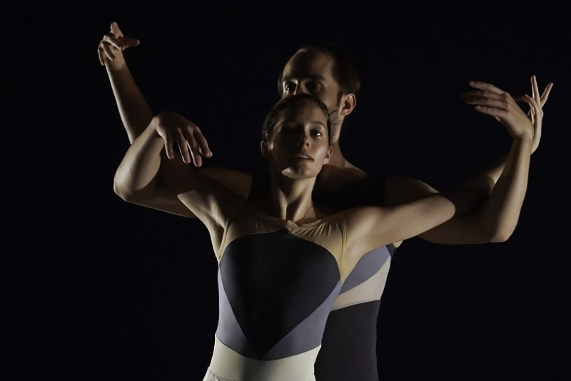 Neon by Claudia Schreier, having its New York premiere, is set to music by Marc Mellits. The dancers, wearing black belted in teal, look sleek and dashing. At curtain rise, two men stand in a pool of light, one behind the other, their arms in sweeping arcs seeming to depict the hands of a clock. Then the dance erupts to the propulsive Mellits music. The sometimes complex partnering motifs Ms. Schreier demands of her dancers are smoothly executed; this is a choreographer who likes to set challenges for her dancers, then rehearse them astutely so they end up looking well-polished.