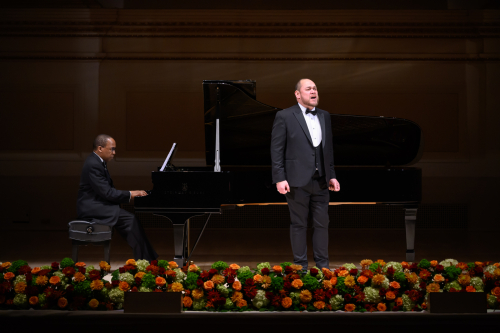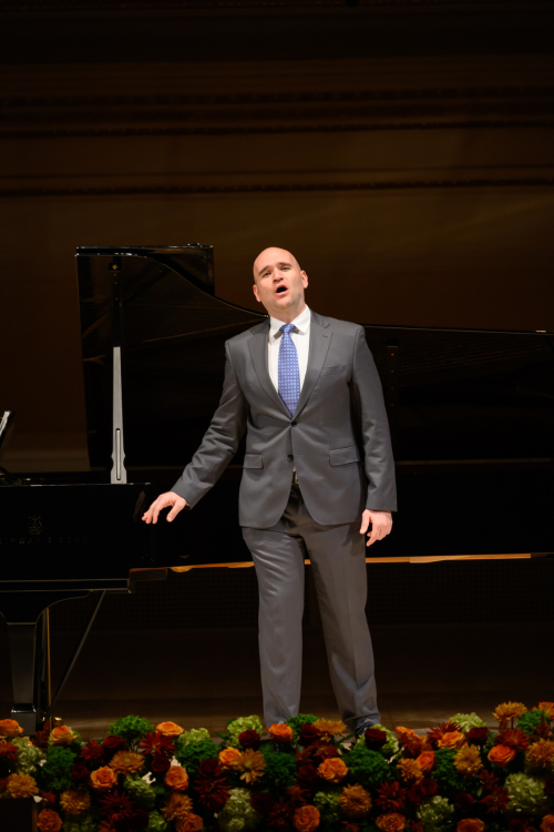 Quinn Kelsey (above, photo by Dario Acosta) then took the stage, accompanied by Howard Watkins, for a truly magnificent “Eri tu” from BALLO IN MASCHERA. This was opera at its grandest, the singer filling the Hall with a flood of golden tone, achingly heartfelt in the character’s distress and his sense of defeat and resignation. This is a baritone voice to rank with the greatest of my experience: Warren, Merrill, MacNeil, Milnes, and the unforgettable Dmitri Hvorostovsky.