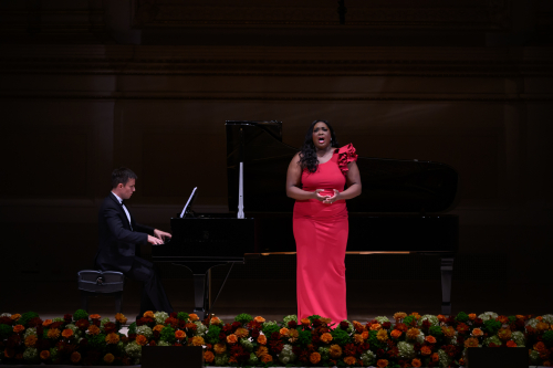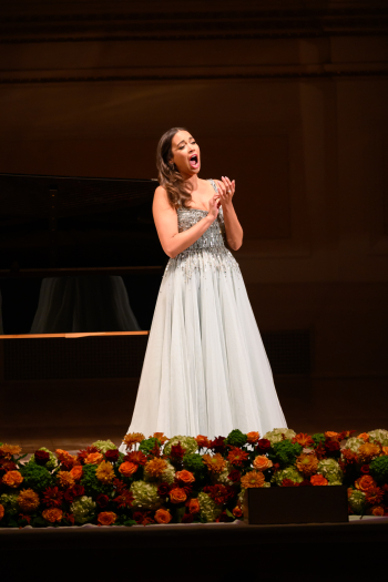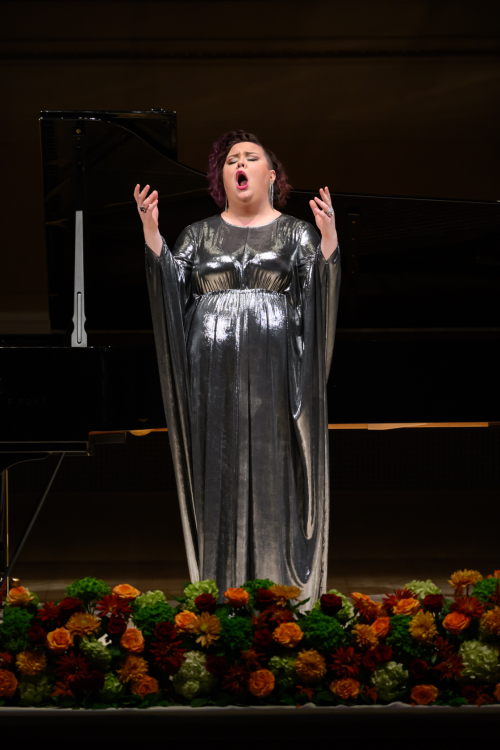 Rachel Willis-Sorenson (above, photo by Dario Acosta), who the day before had joined Jamie Barton and Michael Fabiano in a rousing Met matinee of TROVATORE, today gave us the immortal “Casta viva” from Bellini’s NORMA. Although this bel canto jewel really needs an orchestra-and-chorus setting, Ms. Willis-Soremson and Mr. Wagorn were so persuasive that such concerns became irrelevant. With her impressive breath control, the soprano commanded the long phrases, introducing subtle nuances along the way. She concluded the aria with a gorgeous cadenza and then spun out an incredible inverted trill before sustaining the final note.