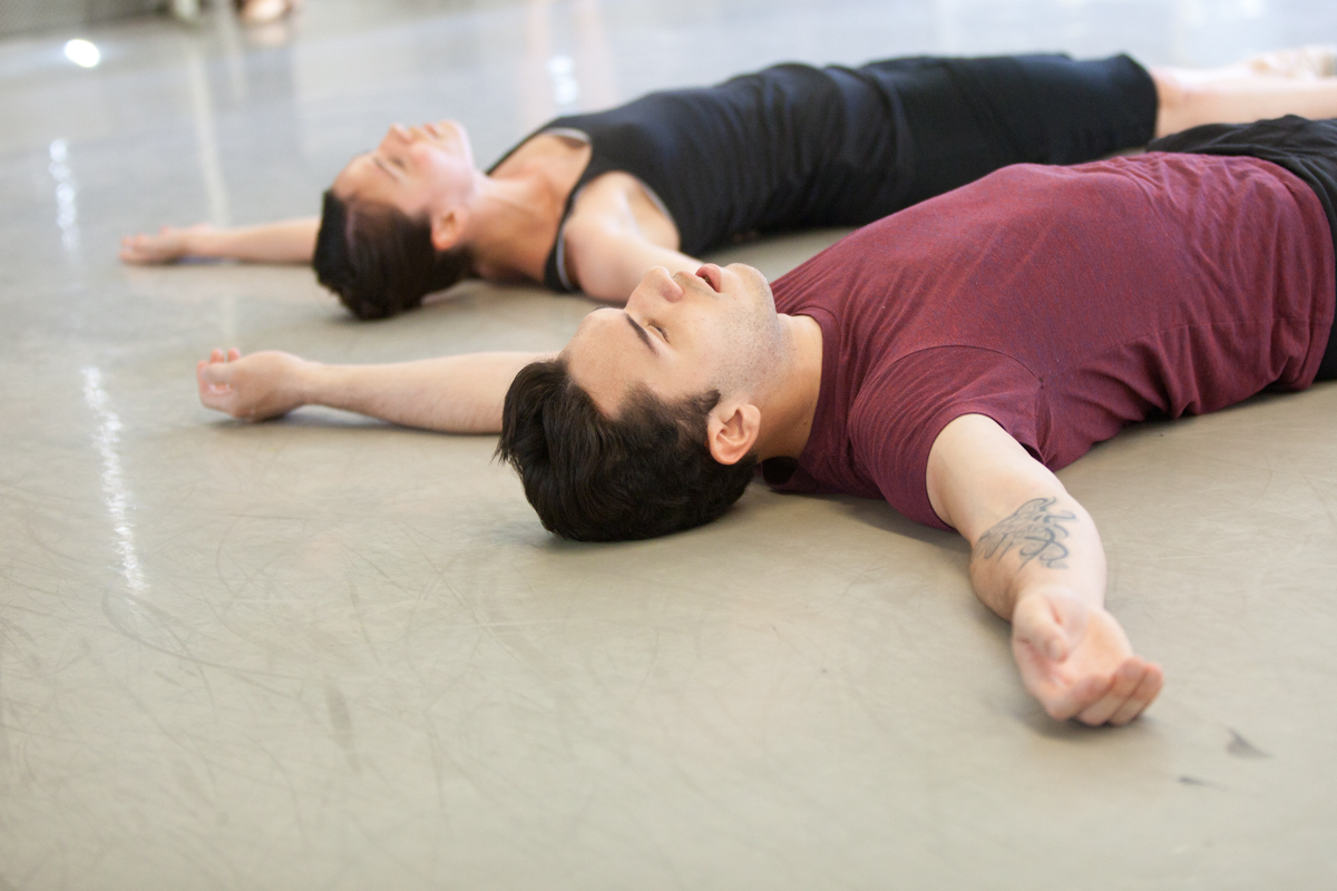 A relentess pulsing rhythm marks the opening of Devin Alberda’s pas de trois entitled Sissy Fists, the title a play on ‘Sisyphus’ but loaded with other implications. To music by Anna Meredith, two tall boys – John Poppe and Taylor Minich, in sleek body tights – are joined by Rebecca Green, dancing on pointe. The boys seem to be bonding but Ms. Green tends to intervene. Tension and traces of levity thread thru this dancework; as the music turns ominous, the boys’ mutual partnering becomes more fervent. The choreography’s dynamics reflect the music; there’s a darkening quality that I really like. It’s a ballet I want to see again.