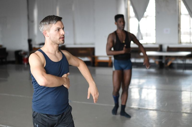 On July 30th, Joshua invited me down to the Martha Graham studios on Bethune Street where he showed me a run-thru of Surface Properties. This was only the second time that the dancers went thru the entire piece; it’s a big-scale and very active ballet, and the Mellits/Gordon score is propulsive and wonderfully danceable. Alternating full-ensemble passages with a series of fleeting solos and pas de deux, trois, et quatre, the work sustains our interest in its complex and sometimes whimsical partnering, unexpected match-ups of dancers, stylized port de bras elements, and unabashed physicality.
