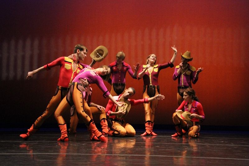 The duet is set to the adagio from Mozart’s Clarinet Concerto, a beloved work that reached a wide audience when it was used in the film Out of Africa. Sylvain LaFortune and Rick Michalek are the dancers in today’s program; clad all in white, they could be lovers, or brothers, or best of friends. The Lubovitch choreography is a poignant response to the music; the men are mutually supportive and tender without becoming cloying. There are solo passages, danced whilst the other man observes. It’s a study in masculine grace.
