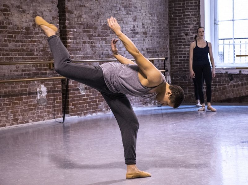 Above: Chazz McBride and Oliver Swan-Jackson take a flying leap; Oliver has just signed on with Lydia Johnson Dance