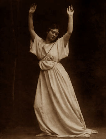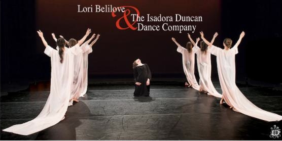 The room was packed to the bursting point as Lori greeted us, and then the dancing immediately commenced. A set of Duncan works set to music of Franz Schubert opened the evening, starting with dancers Hayley Rose and Faith Kimberling as light-hearted nymphs Moment Musical. Throughout the evening, the women wore classic Grecian-style tunics, iconic elements of the Duncan repertoire, in various hues. Emily D’Angelo, in pale blue, danced Lullabye, with the evocative Isadora motif of raising the arms heavenward. Becky Allen and Caroline Yamada, in pink with flowers in their hair, gave us Classical Duet, and then Lori Beliliove, in dark blue, spoke to us in Duncan’s striking gestural language in the waltz-like Water Study.