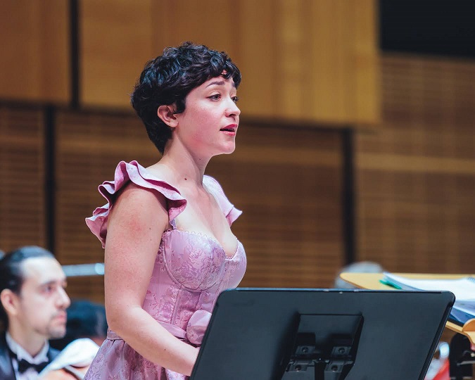 Twinkle, Twinkle Little Star has a delightful delicacy about it; then the music turned livelier and a catchy xylophone ‘cadenza’ established a playful mood. The music fades away at the end. The final song is Speak Roughly To Your Little Boy, introduced by a drum roll. A pulsing beat accompanies this mean mother’s lecture, with tambourine and bassoon interjecting. Now the vocal line goes completely bonkers – Ms. Zara didn’t simply manage it, she triumphed over it – as cymbal crashes bring this dazzling, quirky piece to a close. The soprano basked in a shouting ovation from the crowd, so truly deserved; she graciously signaled her thanks to the musicians and the Maestro.