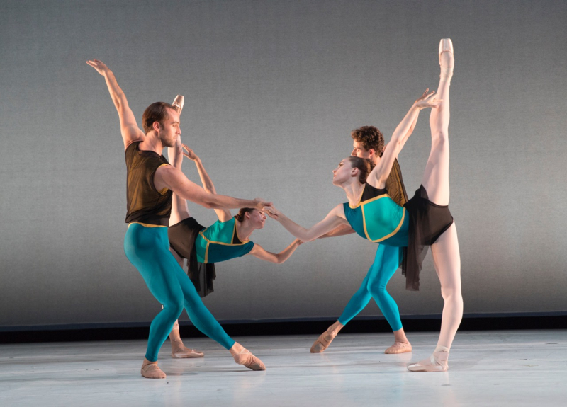 As the lights come up, Martha Chamberlain’s tourquoise/sea-green/black costumes catch the eye – above, Jared Angle, Unity Phelan, Elizabeth Claire Walker, and Dameron Dieck; photo by Travis Magee. The choreography is agile, sometimes stylized, with comings and going and brisk partnering trade-offs. Joined by Da’Von Doane, the dancers follow the music into a lyrical state…