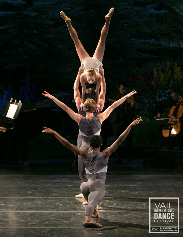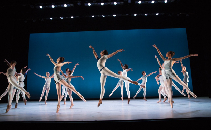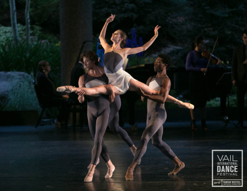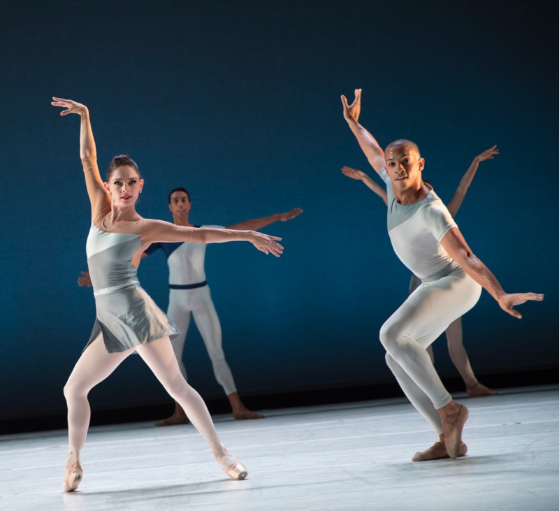 But if we cannot linger long in paradise, then let it be Shostakovich who calls to us: the gentle opening of his Piano Quintet, Opus 57, played by pianist Emily Wong, opens Claudia Schreier’s SOLITAIRE, which was first seen at last summer’s Vail Festival. Unity Phelan leads off the ballet alone to that pensive piano solo; she is soon joined by three men: Jared Angle, Da’Von Doane, and Cameron Dieck, as the strings take up a chorale-like passage.