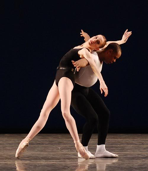 WORDPLAY is an impeccably-crafted duet, danced by New York City Ballet’s Unity Phelan and Jared Angle (above, photo by Travis Magee). Clad in sleek red-and-black body tights from designer Martha Chamberlain, the dancers mirror the changing moods of the Zwilich score in a pairing that shifts from intimate to gently ironic. Jared Angle, always my ideal as a danseur noble, looked thoroughly at home in the supple Schreier choreography, and his partnering skills are to die for. Ms. Phelan’s technical authority is vivid, yet I can’t quite get a sense of the woman inside the dancer.