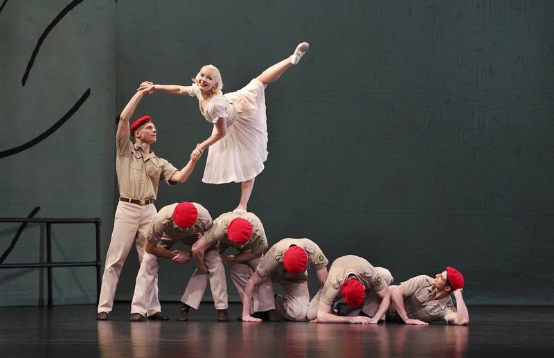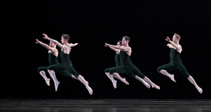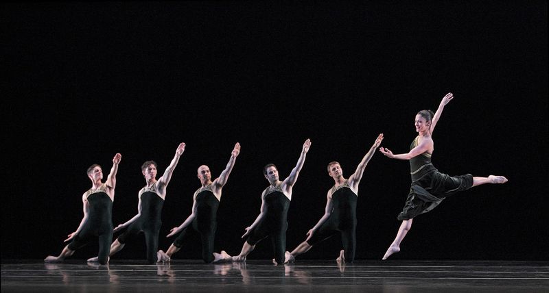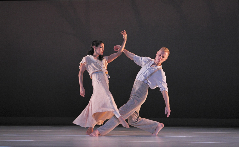 The ensemble dance a graceful and courtly Prelude, then individual couples appear in a series of duets. In the first, Parisa Khobdeh and Michael Trusnovec summon feelings of slightly hesitant tenderness; it finishes with Ms. Khobdeh perched on Mr. Trusnovec’s shoulder. There’s a bit of playfulness in the second duet, with Jamie Rae Walker and Sean Mahoney clearly attracted to one another but not quite sure of how to express it. I really like their partnership.