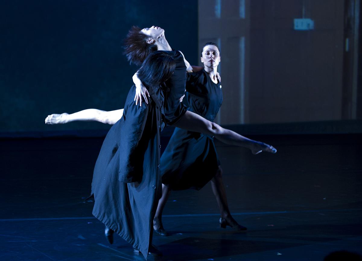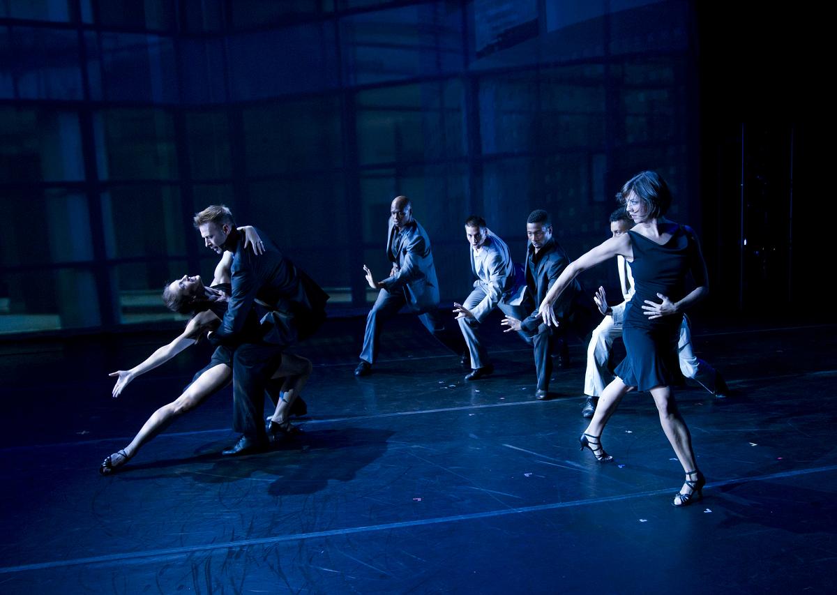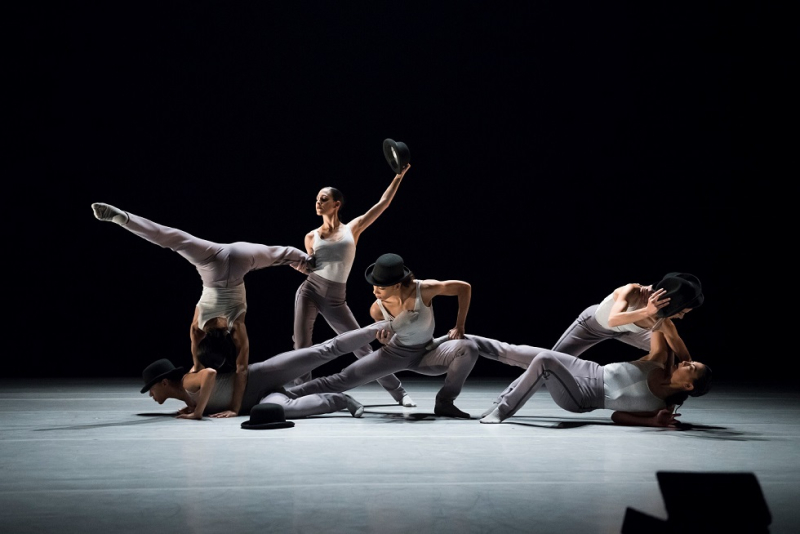 Sombrerísimo was commissioned by New York’s City Center for Fall for Dance in 2013; I was present at the premiere, which was a huge hit with the audience. Choreographed for an all-male ensemble by Belgian-Colombian Annabelle Lopez Ochoa to a collage score by Banda Ionica, Macaco el Mono Loco, and Titi Robin, it of course now has a very different feel as danced by six women: Shelby Colona, Jenna Marie, Eila Valls, Gabrielle Sprauve, Dandara Veiga, and Melissa Verdecia. The movement ranges from swift and accented to cool and sexy, and there’s much by-play with the hats that inspired the ballet’s title. Joshua Preston’s lighting is atmospheric, and often produces a shadow-dancing effect. At the end, the girls toss their hats into the air while dozens of other hats fall from above.