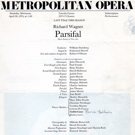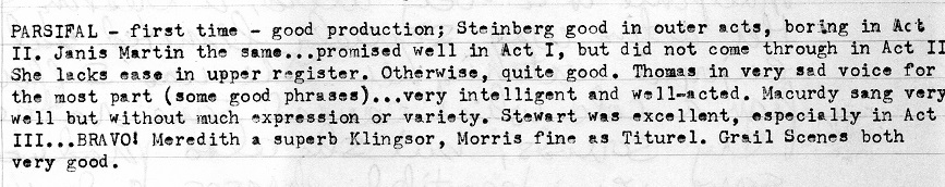 This was my first chance to see this opera; Sandor Konya was at that time the leading exponent of the title role, and my beloved Irene Dalis was singing her venomous Ortrud. Stalwarts Walter Cassel, John Macurdy and William Walker completed the cast. Andre Cluytens, who was to have conducted this production of LOHENGRIN, had died the previous summer and so Joseph Rosenstock was on the podium. I suppose by international standards that Rosenstock was considered a routinier but – inexperienced as I was – I was simply thrilled to be there.