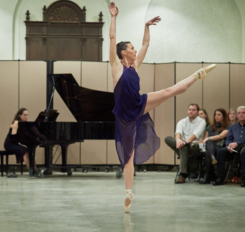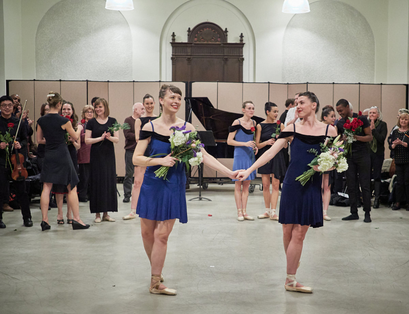 Next came a solo, For Another Day, created by Miro specially for Sarah Atkins. With the piano now back in its usual place at the point of the seating diamond, Melody Fader played the sixth of Franz Schubert’s Moments musicaux to which Ms. Atkins danced with a deep sense of the music’s lyrical flow. Circling the space, the dancer made eye contact with audience members: a beautiful expression of leave-taking. To dance this gorgeously at one’s farewell speaks volumes for Sarah’s technique and artistry. As the solo ended, a tidal wave of vociferous applause cheers was unleashed; everyone stood up to salute the dancer, who had to bow many times.
