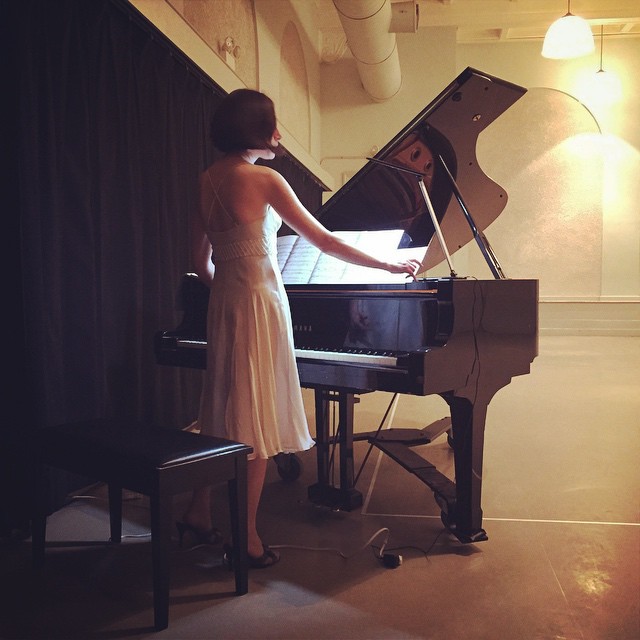 The evening’s program opened with Klavierstück, to solo piano music by Karlheinz Stockhausen. The grand piano had been rolled into the center of the space, where pianist Melody Fader deftly took in stride the composer’s demands. Danced by the evenings two honorees – Elizabeth Brown and Sarah Atkins – it’s a work in which the piano becomes an altar or shrine.