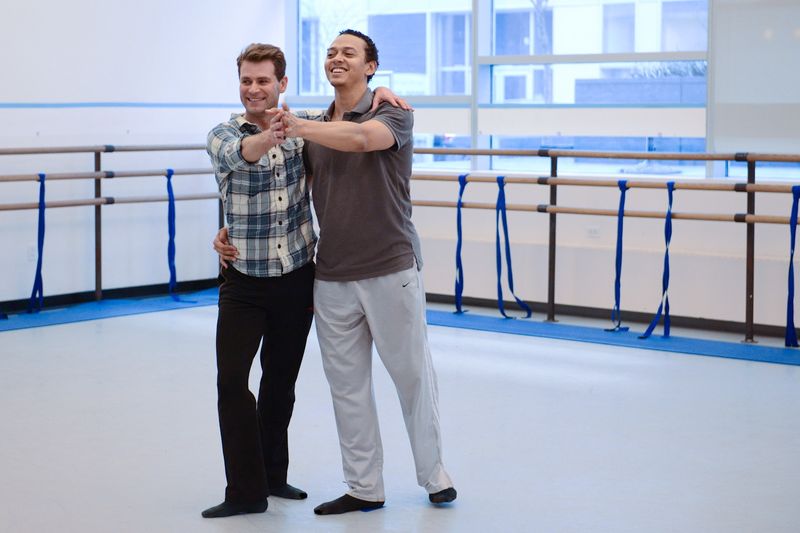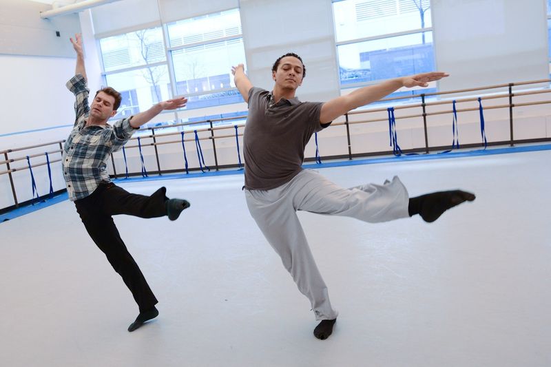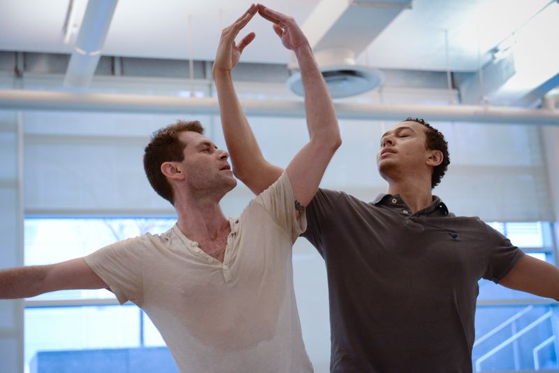 Brothers is next: typically, Steve and Ian bounced back immediately from the opening work and were back onstage seconds later to give classic Parsons-style energy to this two boyz duet: an athletic and witty piece (co-choreographed by Parsons and Daniel Ezralow). To a quirky Stravinsky score (Concertino for 12 Instruments) the two boys nudge, flip, twist and turn their way thru this comradely duet.