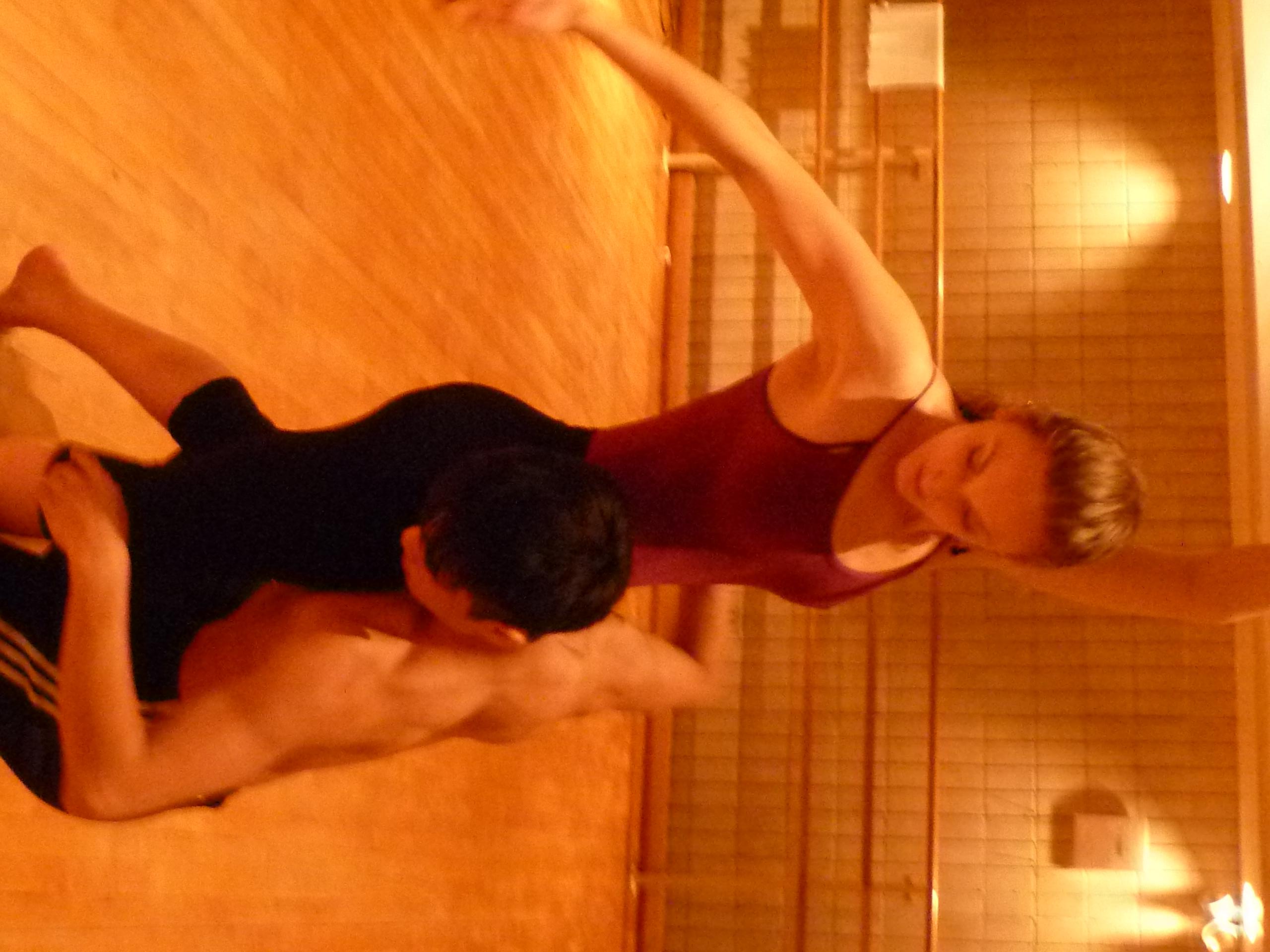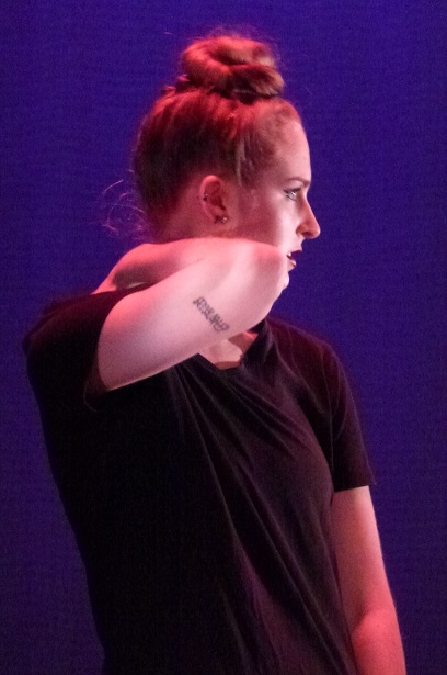Ashley Peters appeared as an Emerging Artist in BalaSole‘s Autumn 2013 concert: VISAGES. I thought then that she showed real potential, and tonight she was back in a solo work: Past and Pending. To music by Outside – violin over a heavy metallic beat – Ashley covered the space in restless, dynamic moves, her body talking to us directly.