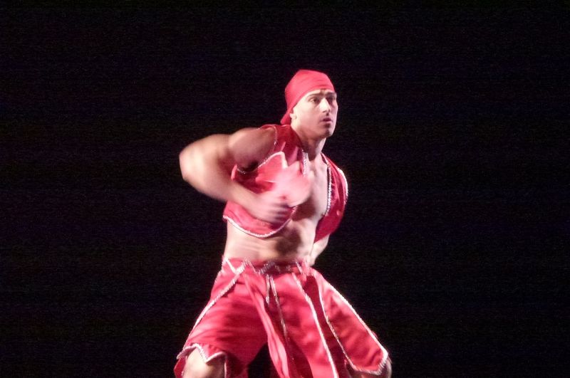 Hunter Frederick Houde’s Afro-Cuban solo Changó emerges from Santeria folk legend: Changó is the owner of fire, lightening, thunder, and war, but he is also the patron of music, drumming, and dancing. He represents male beauty and virility, passion and power. Dressed in red and carrying a small hatchet, the dancer’s moves were vibrant and instinctive; rolling thunder, folklike chant/vocals and intense drumming push this fiery solo to its conclusion: a huge thunderclap as the lights go out.